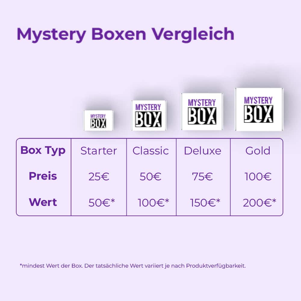 Alle Mystery Boxen werden direkt aus Deutschland versendet und erreichen dich innerhalb weniger Werktage. Ab einem Bestellwert von 75€ ist der Versand für dich kostenlos. Jede Sendung wird mit einer Trackingnummer versehen, damit du den Lieferstatus jederzeit verfolgen kannst.